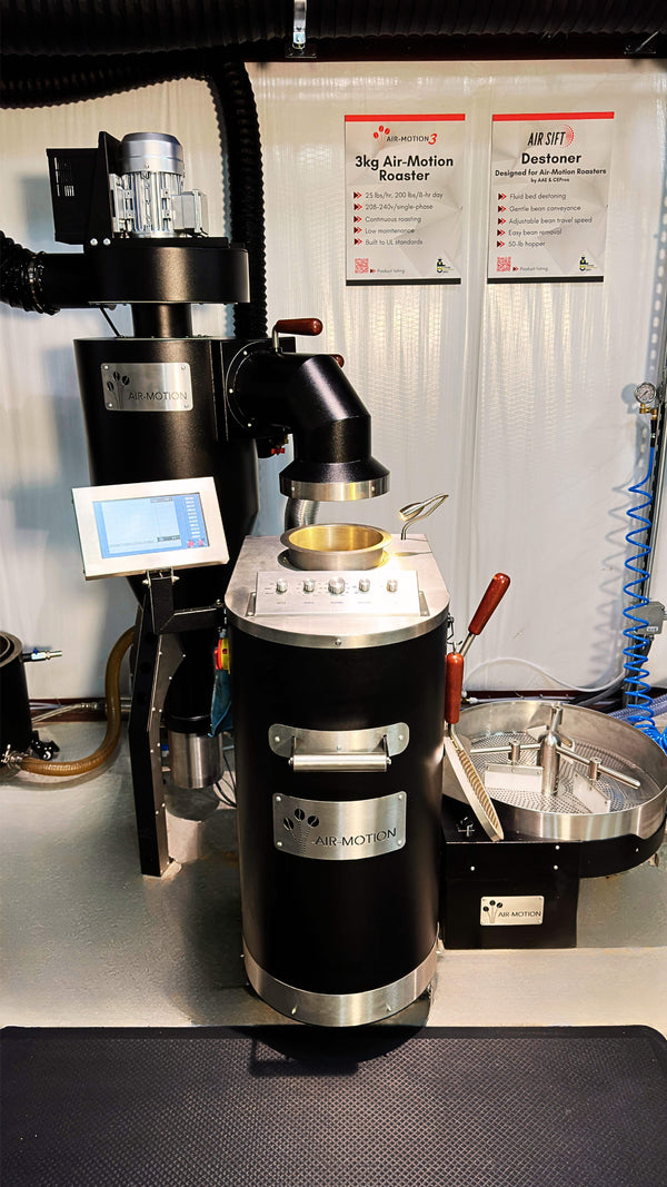Anchored by two Air-Motion Roasters (3kg and 6kg, with 12kg available), the space demonstrates how an all-electric production model can deliver consistency, control, and scalability that rival, if not outperform, fuel-driven equipment.