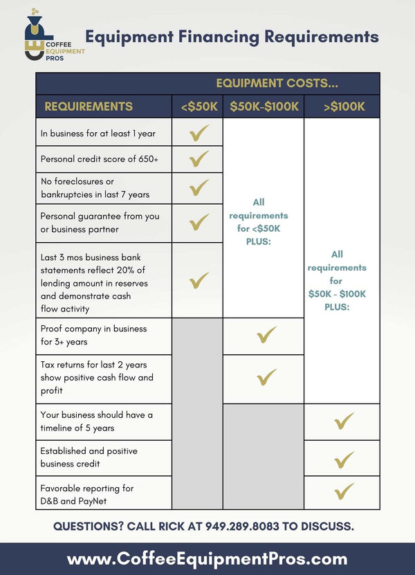 The chart to the right outlines eligibility requirements. If you meet these criteria, then great! You're ready to proceed with the finance application on the equipment listing page. If you have any concerns or questions, please don't hesitate to contact us.